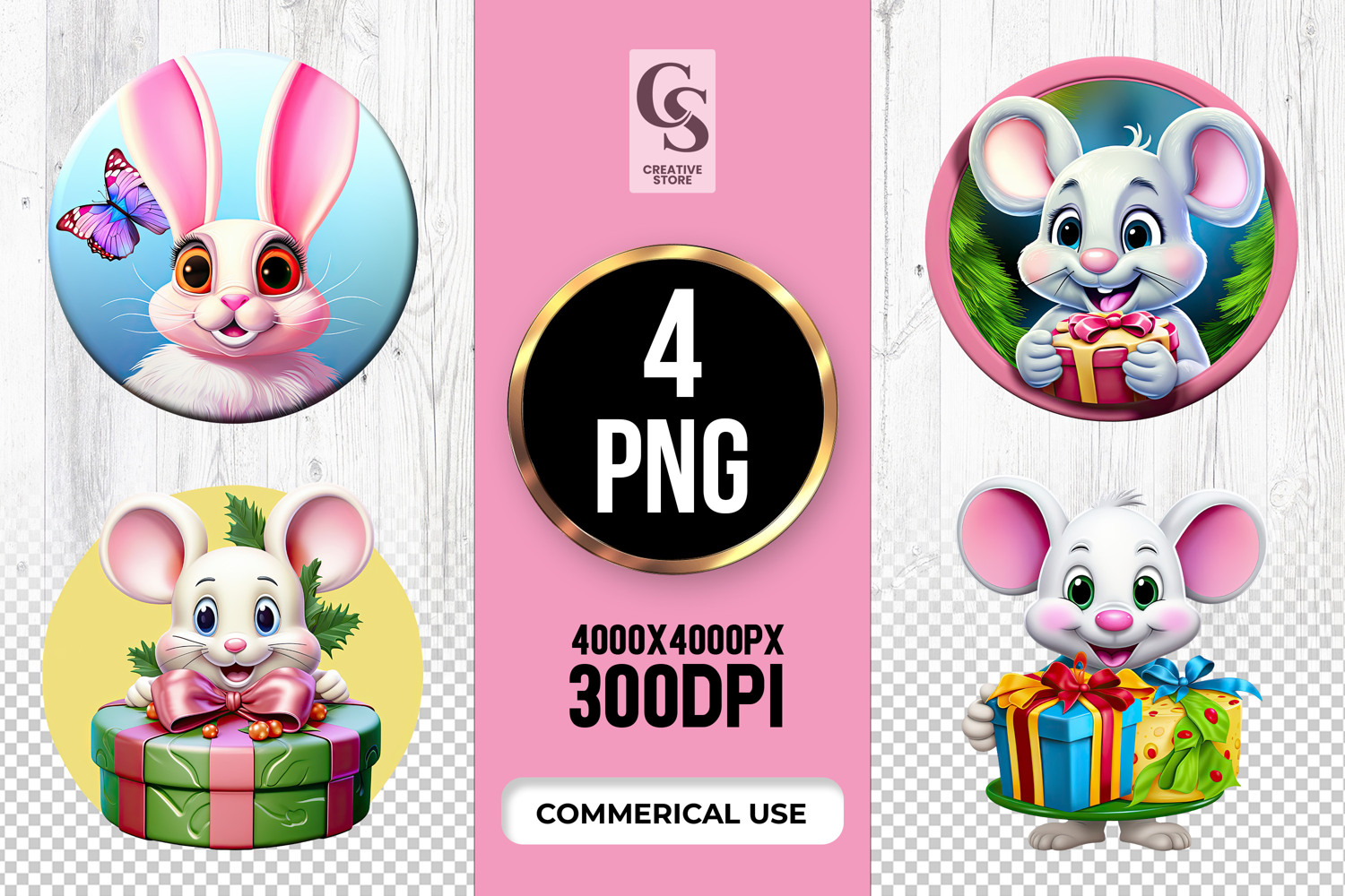 4 Cute Bunny And Mouse Gift Clipart Sublimation PNG Files Perfect for Greeting Cards, Invitations, Junk Journal, Party Decor, Scrapbooking and many other craft projects.