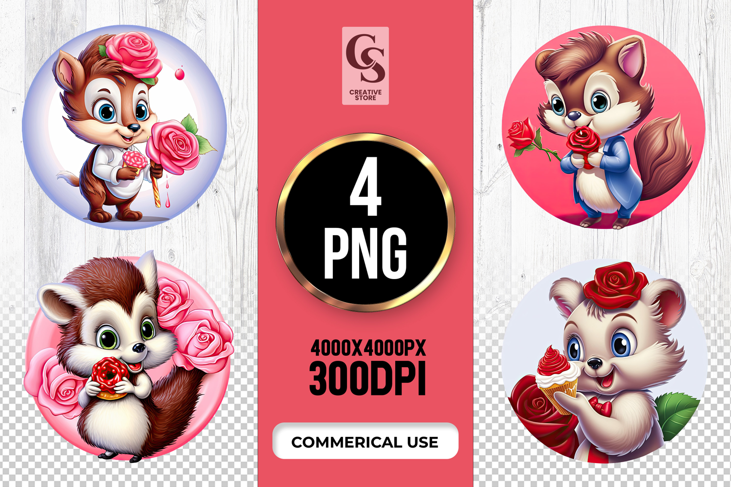 4 Cute Squirrel With Rose Clipart Sublimation PNG Files Perfect for Greeting Cards, Invitations, Junk Journal, Party Decor, Scrapbooking and many other craft projects.