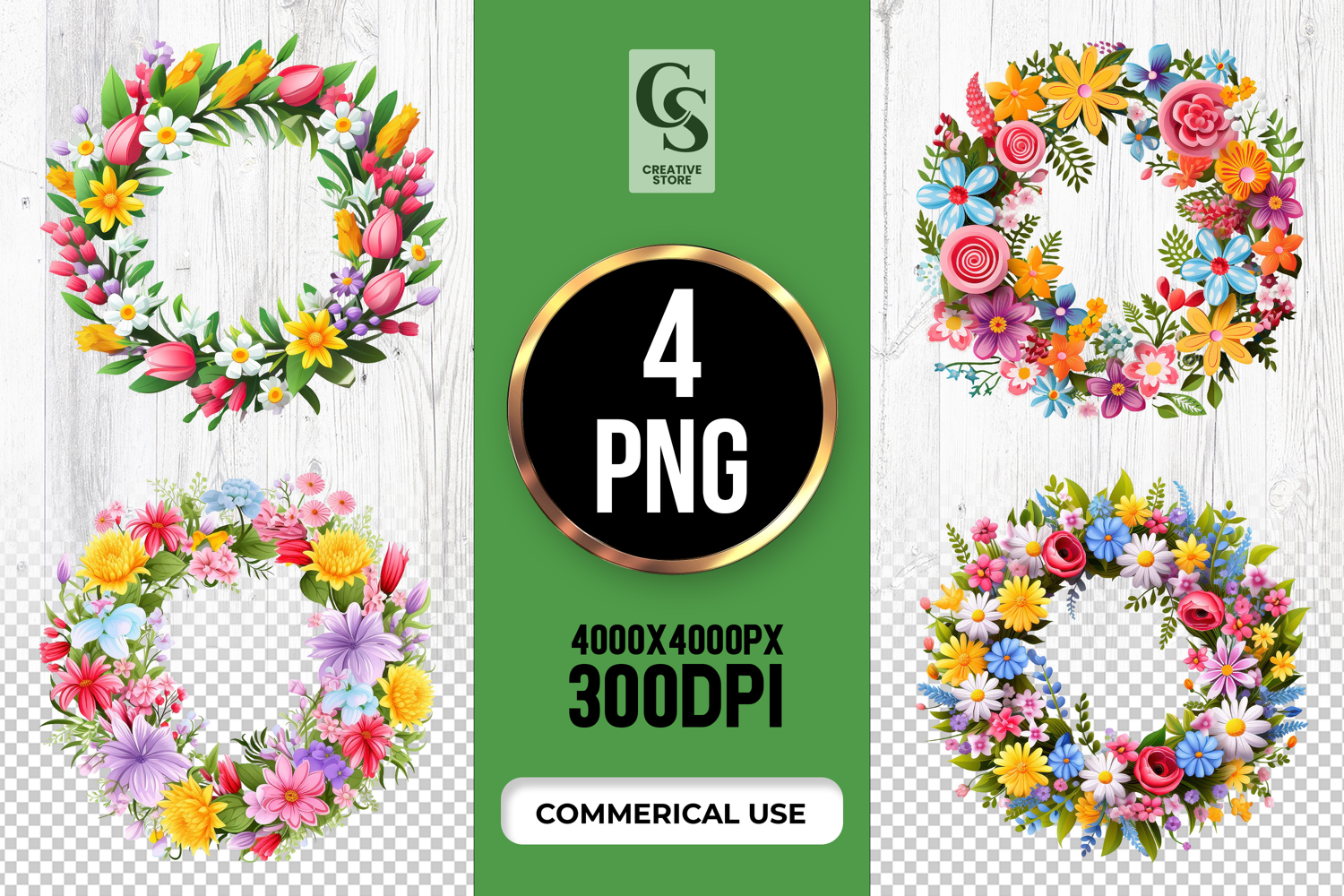 4 Colorful Floral Wreath Clipart Sublimation PNG Files Perfect for Greeting Cards, Invitations, Junk Journal, Party Decor, Scrapbooking and many other craft projects.