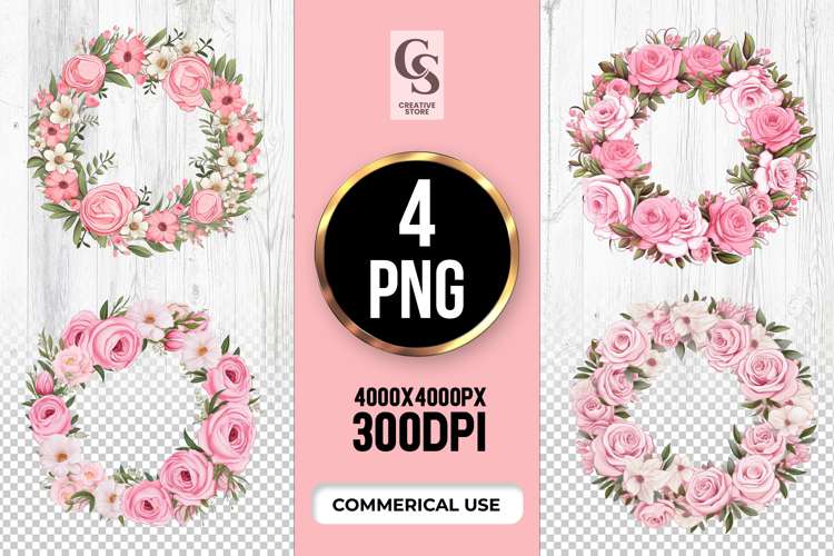 4 Pink Rose Floral Wreath Clipart Sublimation PNG Files Perfect for Greeting Cards, Invitations, Junk Journal, Party Decor, Scrapbooking and many other craft projects.
