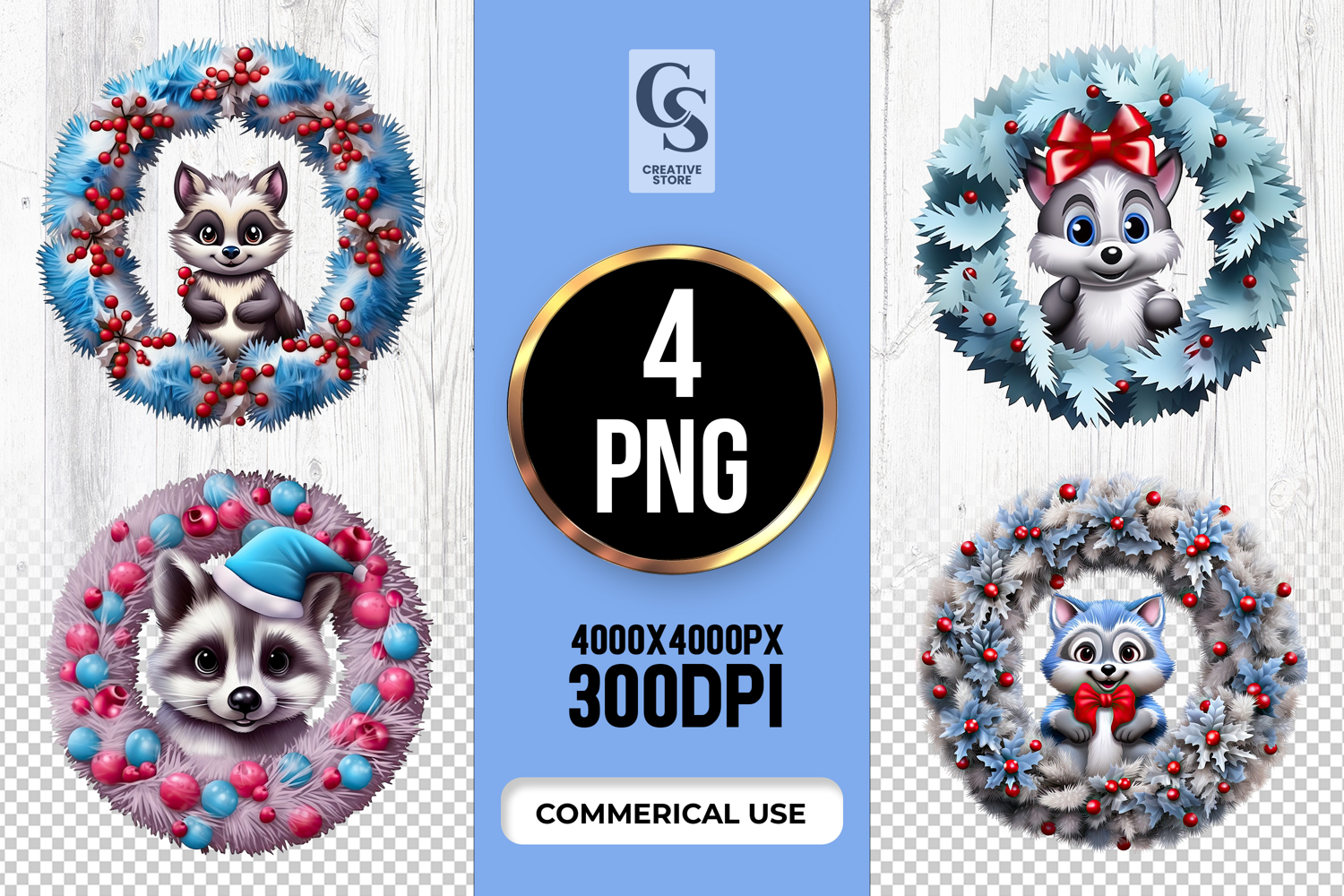 4 Cute Raccoon In Winter Wreath Clipart Sublimation PNG Files Perfect for Greeting Cards, Invitations, Junk Journal, Party Decor, Scrapbooking and many other craft projects.