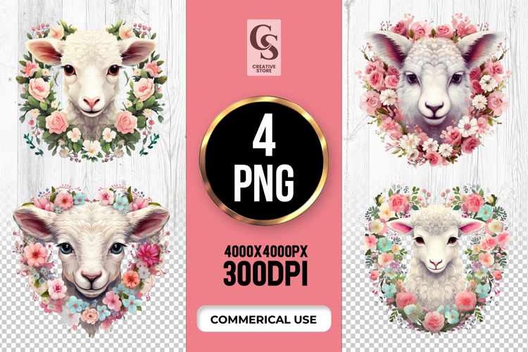 4 Cute Baby Lamb With Floral Wreath Clipart Sublimation PNG Files Perfect for Greeting Cards, Invitations, Junk Journal, Party Decor, Scrapbooking and many other craft projects.