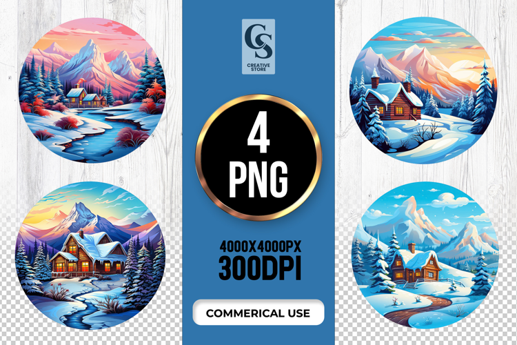 4 Snow Cabin Mountain Landscape Clipart Sublimation PNG Files Perfect for Greeting Cards, Invitations, Junk Journal, Party Decor, Scrapbooking and many other craft projects.