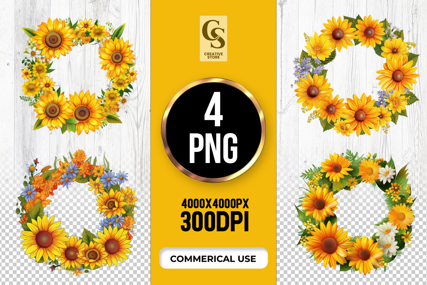 4 Sunflower Floral Wreath Frame Clipart Sublimation PNG Files Perfect for Greeting Cards, Invitations, Junk Journal, Party Decor, Scrapbooking and many other craft projects.