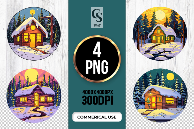 4 Cozy Winter Cabin Scenery Clipart Sublimation PNG Files Perfect for Greeting Cards, Invitations, Junk Journal, Party Decor, Scrapbooking and many other craft projects.