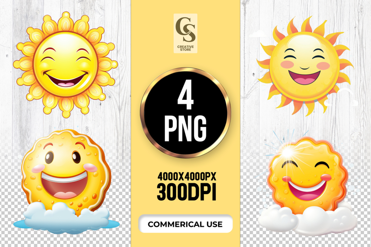 4 Smiling Sun clipart sublimation png Files Perfect for Greeting Cards, Invitations, Junk Journal, Party Decor, Scrapbooking and many other craft projects.