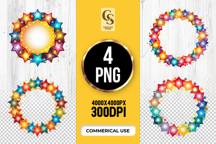 4 Colorful Star Wreath Clipart Sublimation PNG Files Perfect for Greeting Cards, Invitations, Junk Journal, Party Decor, Scrapbooking and many other craft projects.