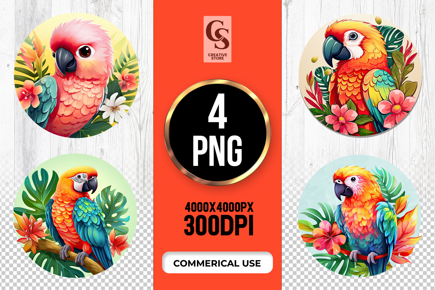 4 Colorful Parrot Clipart Sublimation PNG Files Perfect for Greeting Cards, Invitations, Junk Journal, Party Decor, Scrapbooking and many other craft projects.