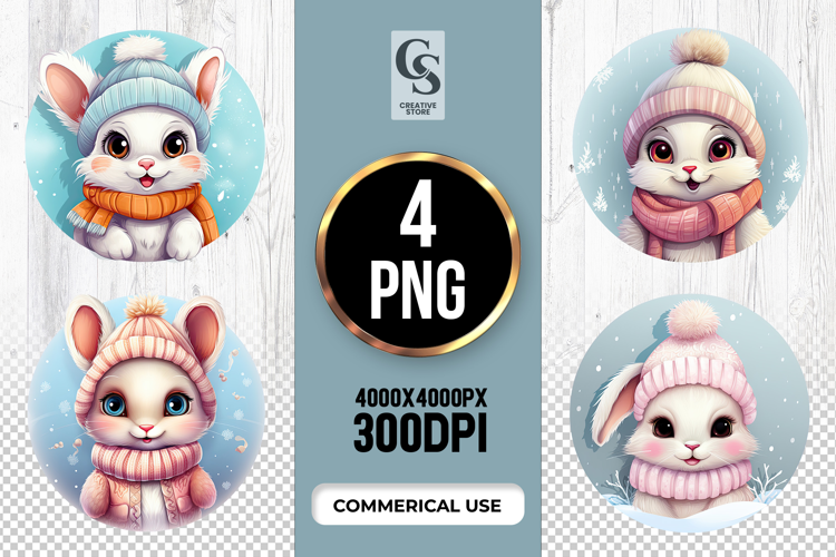 4 Winter Bunny Clipart Sublimation PNG Files Perfect for Greeting Cards, Invitations, Junk Journal, Party Decor, Scrapbooking and many other craft projects.
