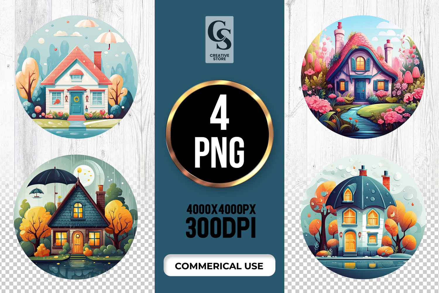 4 Colorful Cottage Clipart Sublimation PNG Files Perfect for Greeting Cards, Invitations, Junk Journal, Party Decor, Scrapbooking and many other craft projects.