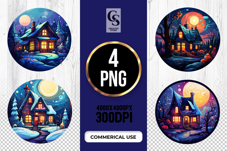 4 Moonlit Cottage Clipart Sublimation PNG Files Perfect for Greeting Cards, Invitations, Junk Journal, Party Decor, Scrapbooking and many other craft projects.