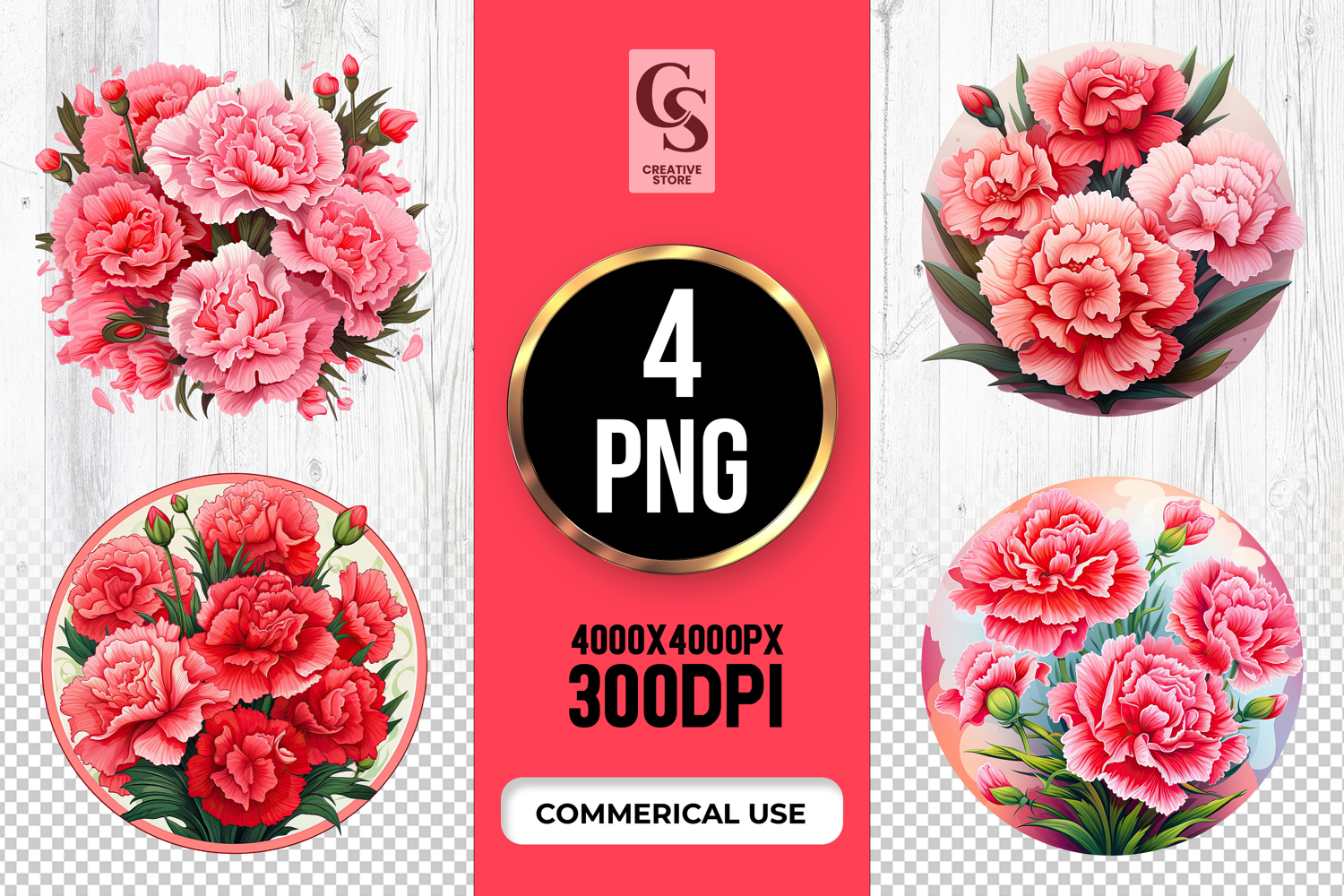 4 Carnation Flower Clipart Sublimation PNG Files Perfect for Greeting Cards, Invitations, Junk Journal, Party Decor, Scrapbooking and many other craft projects.