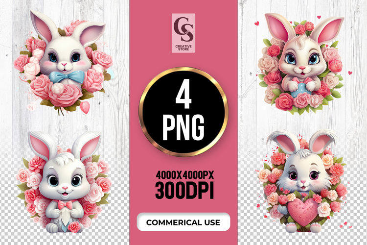 4 Floral Bunny Clipart Sublimation PNG Files Perfect for Greeting Cards, Invitations, Junk Journal, Party Decor, Scrapbooking and many other craft projects.