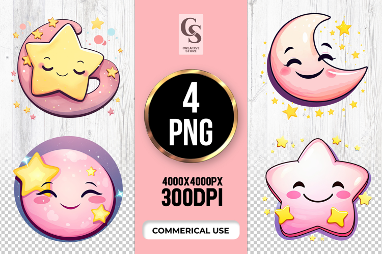4 Star and Moon Clipart Sublimation PNG Files Perfect for Greeting Cards, Invitations, Junk Journal, Party Decor, Scrapbooking and many other craft projects.