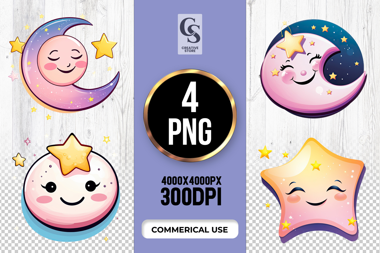 4 Cute Moon Star Clipart Sublimation PNG Files Perfect for Greeting Cards, Invitations, Junk Journal, Party Decor, Scrapbooking and many other craft projects.