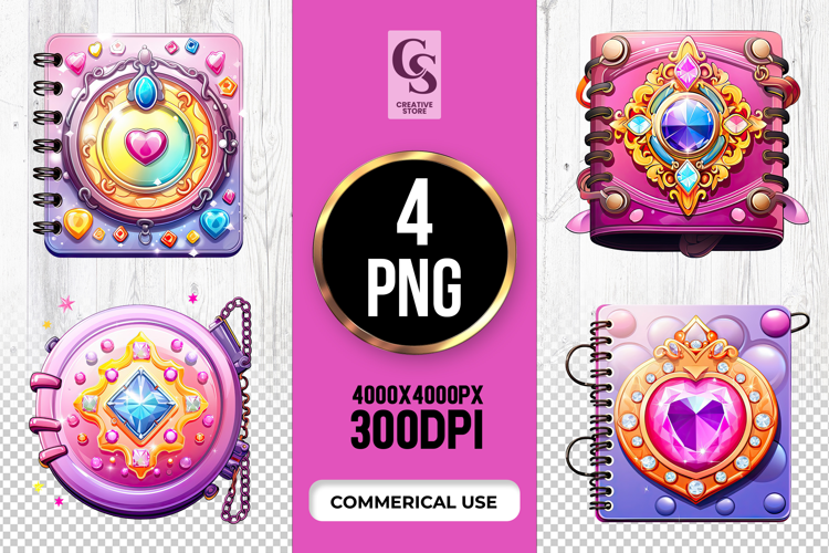 4 Magical gem notebook Clipart Sublimation PNG Files Perfect for Greeting Cards, Invitations, Junk Journal, Party Decor, Scrapbooking and many other craft projects.