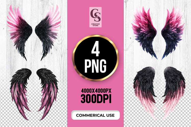 4 Black and Pink Ombre Angel Wings Clipart Sublimation Png Files Perfect for Greeting Cards, Invitations, Junk Journal, Party Decor, Scrapbooking and many other craft projects.