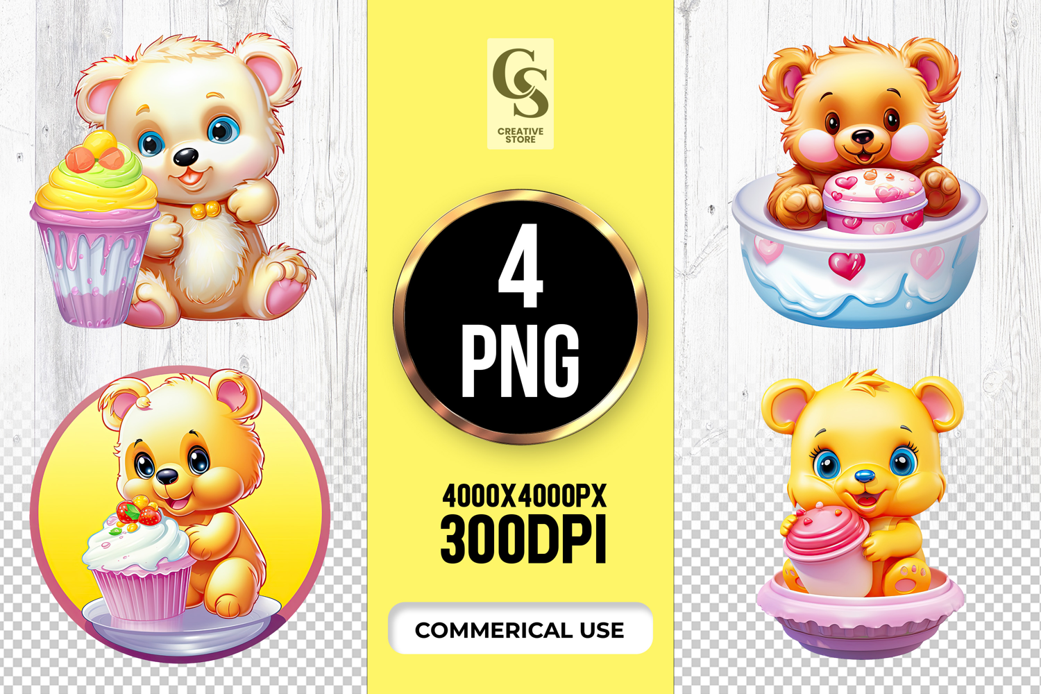 4 Cartoon Bear Sweet Treat Dessert Clipart Sublimation Png Files Perfect for Greeting Cards, Invitations, Junk Journal, Party Decor, Scrapbooking and many other craft projects.