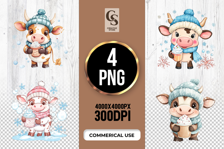 Winter Cow Clipart Sublimation PNG Files Perfect for Greeting Cards, Invitations, Junk Journal, Party Decor, Scrapbooking and many other craft projects.