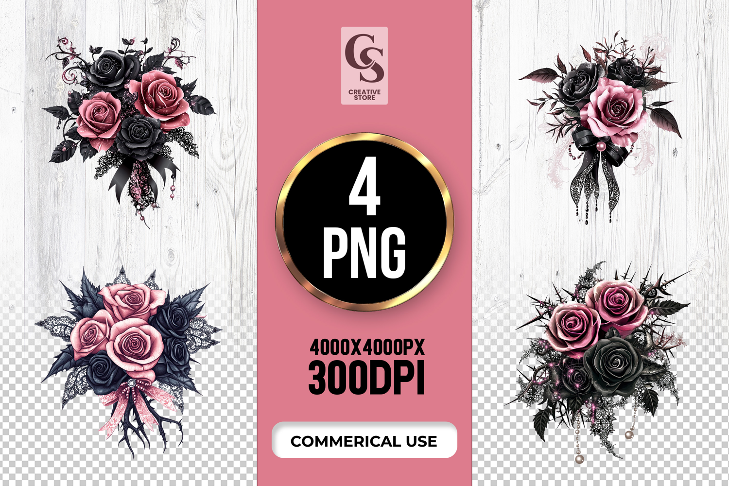 4 Gothic Rose Bouquet Clipart Sublimation PNG Files Perfect for Greeting Cards, Invitations, Junk Journal, Party Decor, Scrapbooking and many other craft projects.