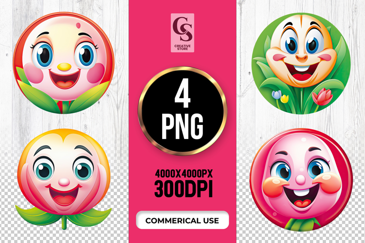 4 Smiling Flower Faces Clipart Sublimation PNG Files Perfect for Greeting Cards, Invitations, Junk Journal, Party Decor, Scrapbooking and many other craft projects.