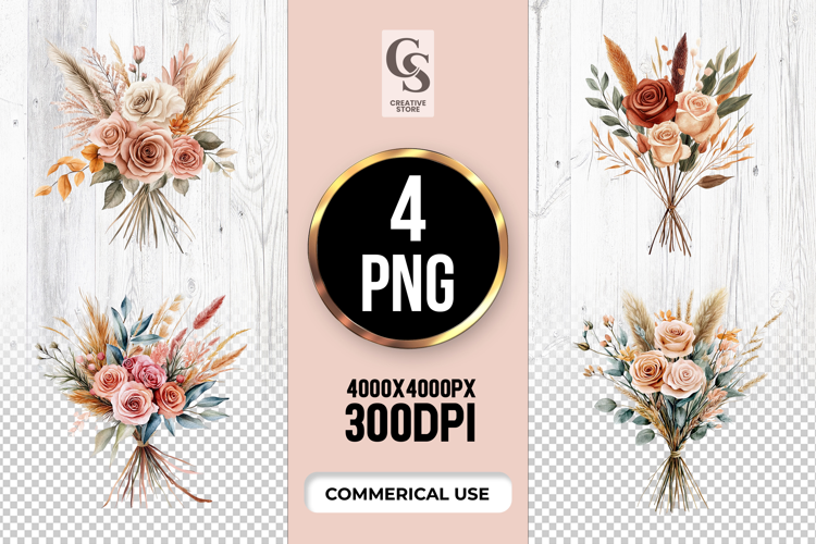 4 Boho Floral Bouquet Clipart Sublimation PNG Files Perfect for Greeting Cards, Invitations, Junk Journal, Party Decor, Scrapbooking and many other craft projects.