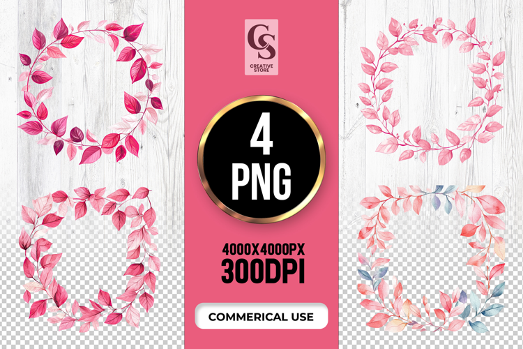 4 Pink Floral Leaf Wreath Clipart Sublimation PNG Files Perfect for Greeting Cards, Invitations, Junk Journal, Party Decor, Scrapbooking and many other craft projects.