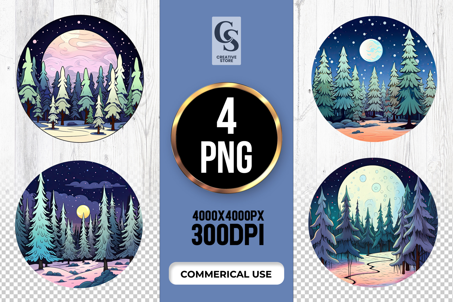 4 Winter Night Forest Clipart Sublimation PNG Files Perfect for Greeting Cards, Invitations, Junk Journal, Party Decor, Scrapbooking and many other craft projects.