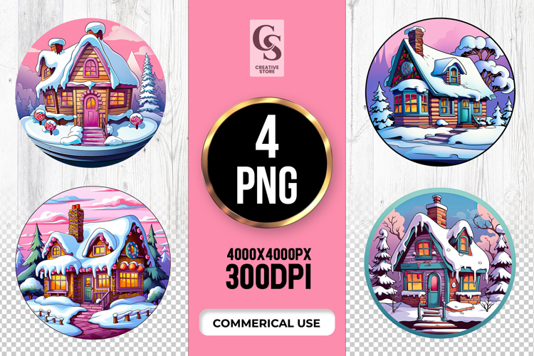 4 Cozy Winter Snow Cottage Clipart Sublimation PNG Files Perfect for Greeting Cards, Invitations, Junk Journal, Party Decor, Scrapbooking and many other craft projects.