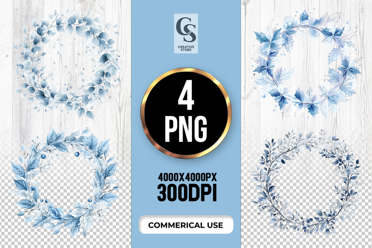 4 Blue Winter Leaf Wreath Clipart Sublimation PNG Files Perfect for Greeting Cards, Invitations, Junk Journal, Party Decor, Scrapbooking and many other craft projects.