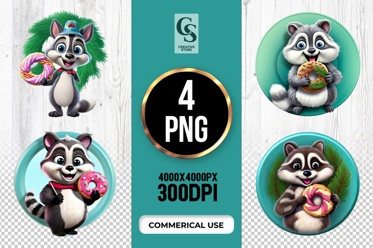 4 Cute Raccoon With Donut Clipart Sublimation PNG Files Perfect for Greeting Cards, Invitations, Junk Journal, Party Decor, Scrapbooking and many other craft projects.
