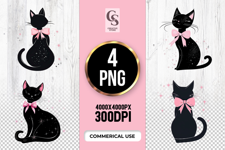 4 Cute Black Cat Bow Clipart Sublimation PNG Files Perfect for Greeting Cards, Invitations, Junk Journal, Party Decor, Scrapbooking and many other craft projects.