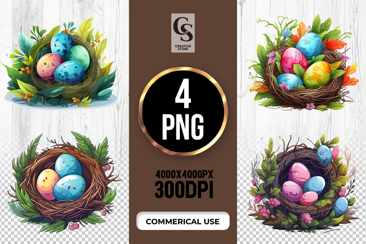 4 Colorful Bird Nest Eggs Clipart Sublimation PNG Files Perfect for Greeting Cards, Invitations, Junk Journal, Party Decor, Scrapbooking and many other craft projects.