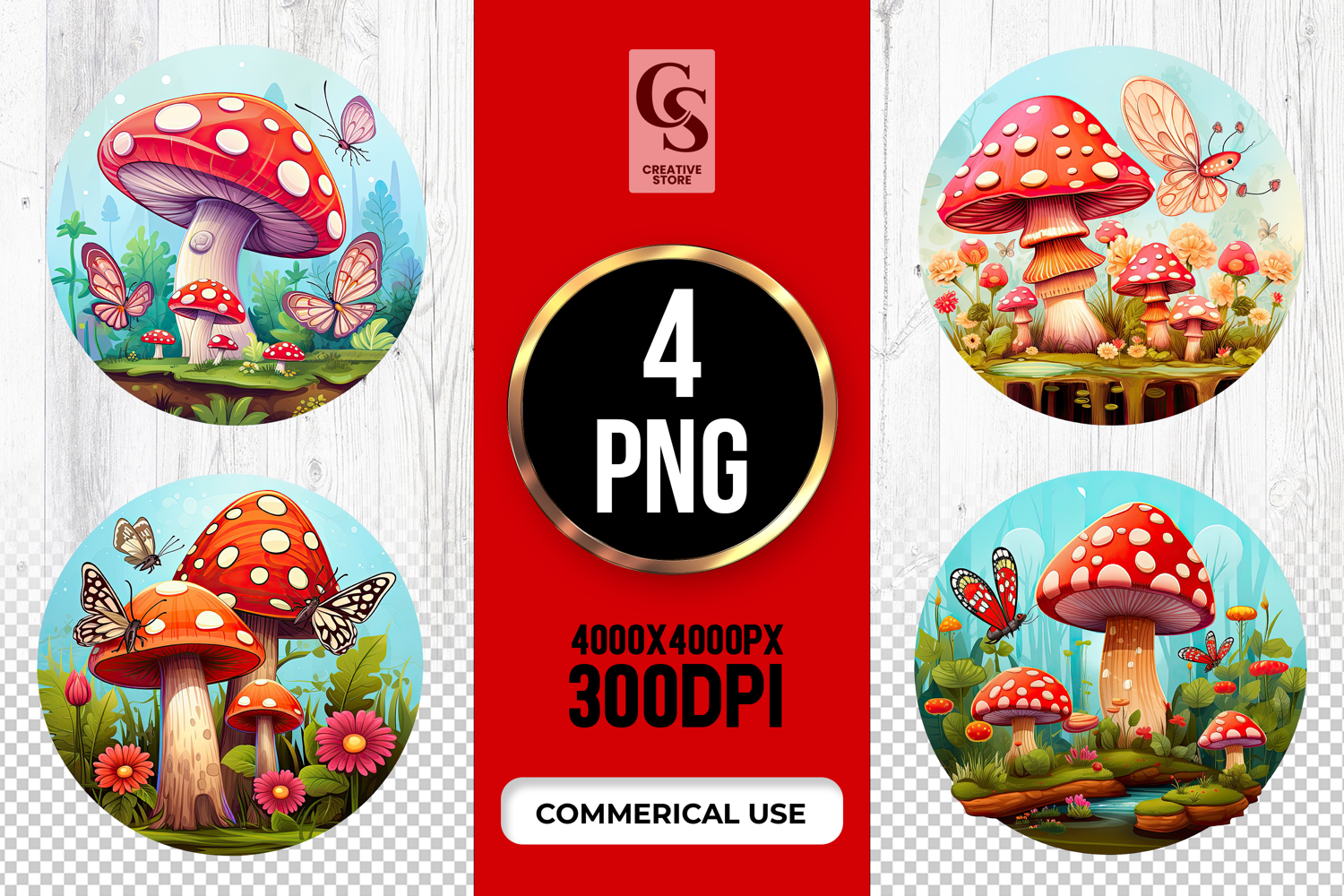 4 Red Mushroom Forest Clipart Sublimation PNG Files Perfect for Greeting Cards, Invitations, Junk Journal, Party Decor, Scrapbooking and many other craft projects.