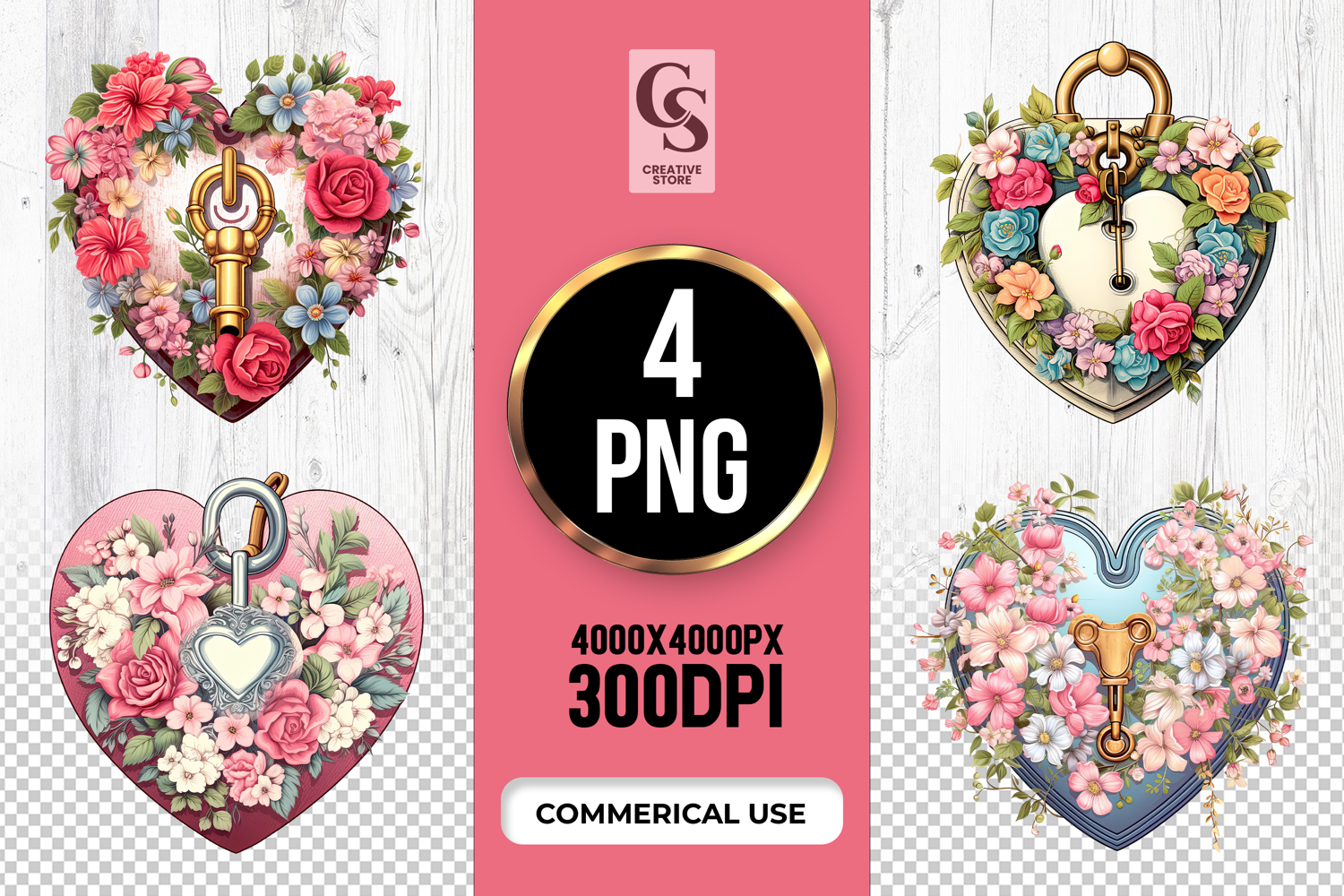 4 Floral Heart Lock Clipart Sublimation PNG Files Perfect for Greeting Cards, Invitations, Junk Journal, Party Decor, Scrapbooking and many other craft projects.