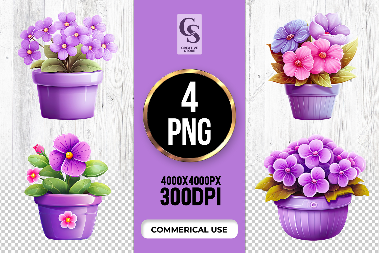 4 Purple Flower Pot Clipart Sublimation PNG Files Perfect for Greeting Cards, Invitations, Junk Journal, Party Decor, Scrapbooking and many other craft projects.