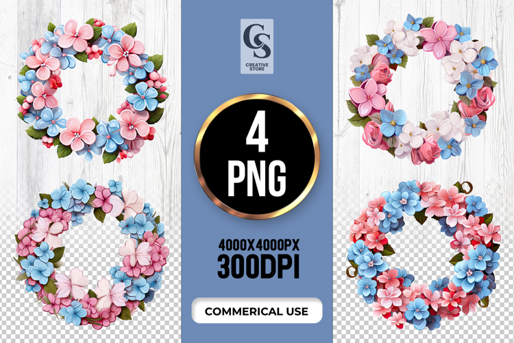 4 Pink Blue Floral Wreath Clipart Sublimation PNG Files Perfect for Greeting Cards, Invitations, Junk Journal, Party Decor, Scrapbooking and many other craft projects.