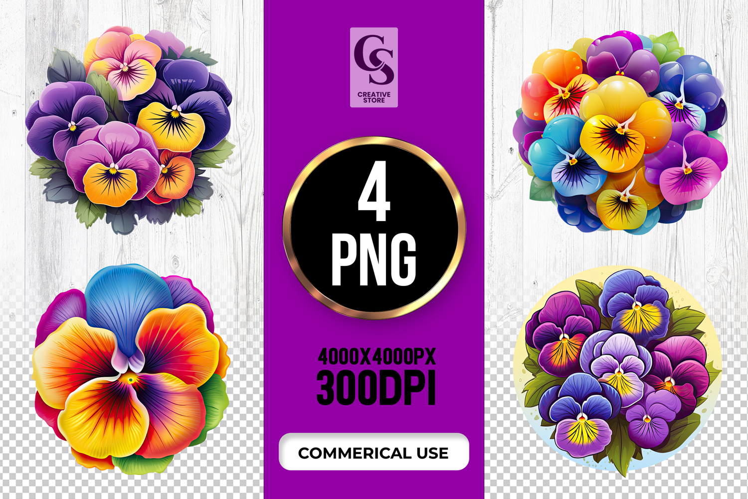4 Pansy Flower Clipart Sublimation PNG Files Perfect for Greeting Cards, Invitations, Junk Journal, Party Decor, Scrapbooking and many other craft projects.