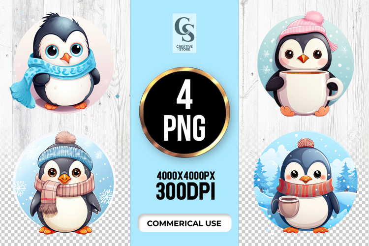 4 Cute Winter Penguin Clipart Sublimation PNG Files Perfect for Greeting Cards, Invitations, Junk Journal, Party Decor, Scrapbooking and many other craft projects.