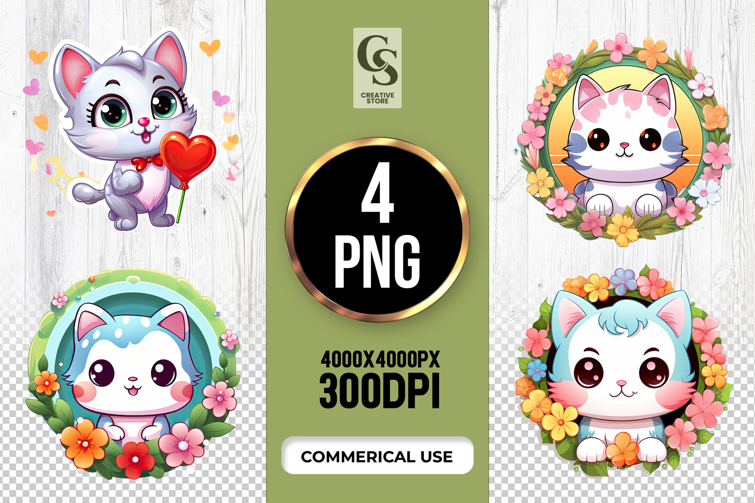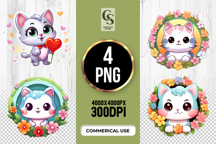 4 Cute Floral Cat Clipart Sublimation PNG Files Perfect for Greeting Cards, Invitations, Junk Journal, Party Decor, Scrapbooking and many other craft projects.
