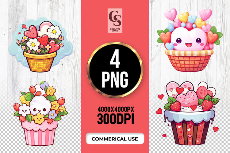 4 Cute Heart Flower Basket Clipart Sublimation PNGG Files Perfect for Greeting Cards, Invitations, Junk Journal, Party Decor, Scrapbooking and many other craft projects.