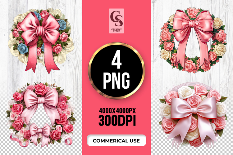4 Rose Wreath Bow Clipart Sublimation PNG Files Perfect for Greeting Cards, Invitations, Junk Journal, Party Decor, Scrapbooking and many other craft projects.