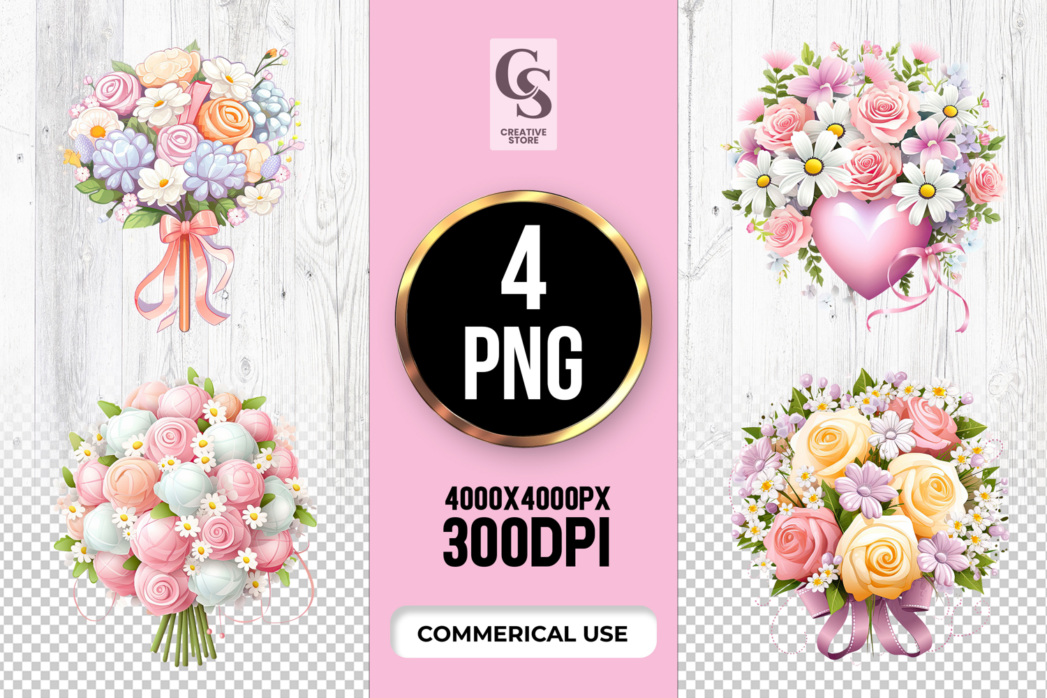 4 Pastel Flower Bouquet Clipart Sublimation PNG Files Perfect for Greeting Cards, Invitations, Junk Journal, Party Decor, Scrapbooking and many other craft projects.