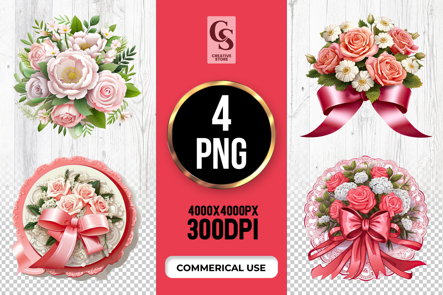 4 Rose Bouquet Clipart Sublimation PNG Files Perfect for Greeting Cards, Invitations, Junk Journal, Party Decor, Scrapbooking and many other craft projects.