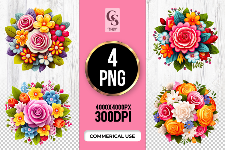 4 Colorful Floral Bouquet Clipart Sublimation PNG Files Perfect for Greeting Cards, Invitations, Junk Journal, Party Decor, Scrapbooking and many other craft projects.