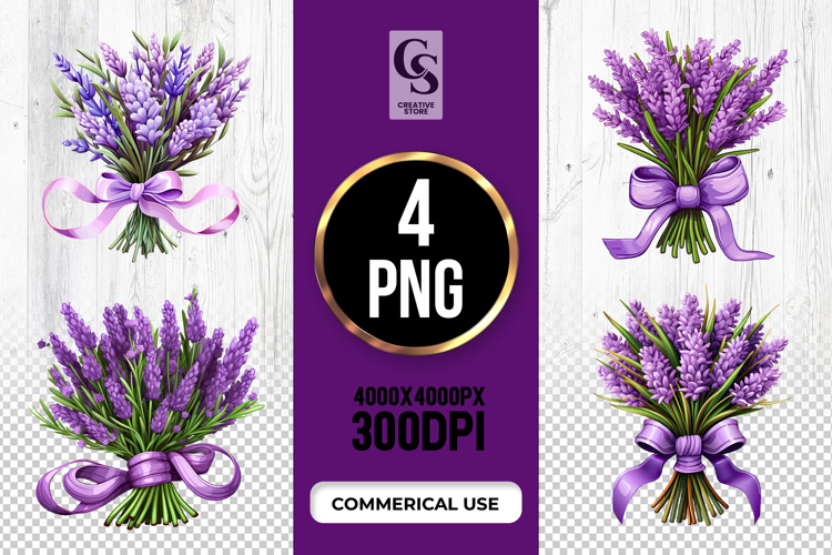 4 Lavender Flower With Ribbons Clipart Sublimation PNG Files Perfect for Greeting Cards, Invitations, Junk Journal, Party Decor, Scrapbooking and many other craft projects.