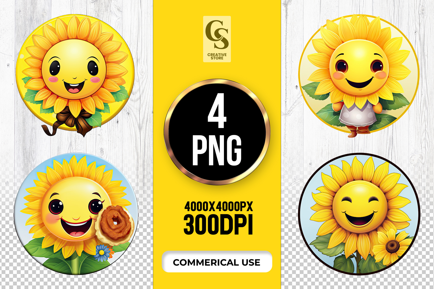 4 Cute Kawaii Sunflower Faces Clipart Sublimation PNG Files Perfect for Greeting Cards, Invitations, Junk Journal, Party Decor, Scrapbooking and many other craft projects.