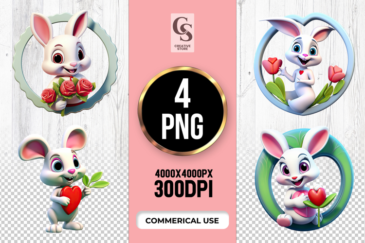 4 Cute Love Bunny Clipart Sublimation PNG Files Perfect for Greeting Cards, Invitations, Junk Journal, Party Decor, Scrapbooking and many other craft projects.