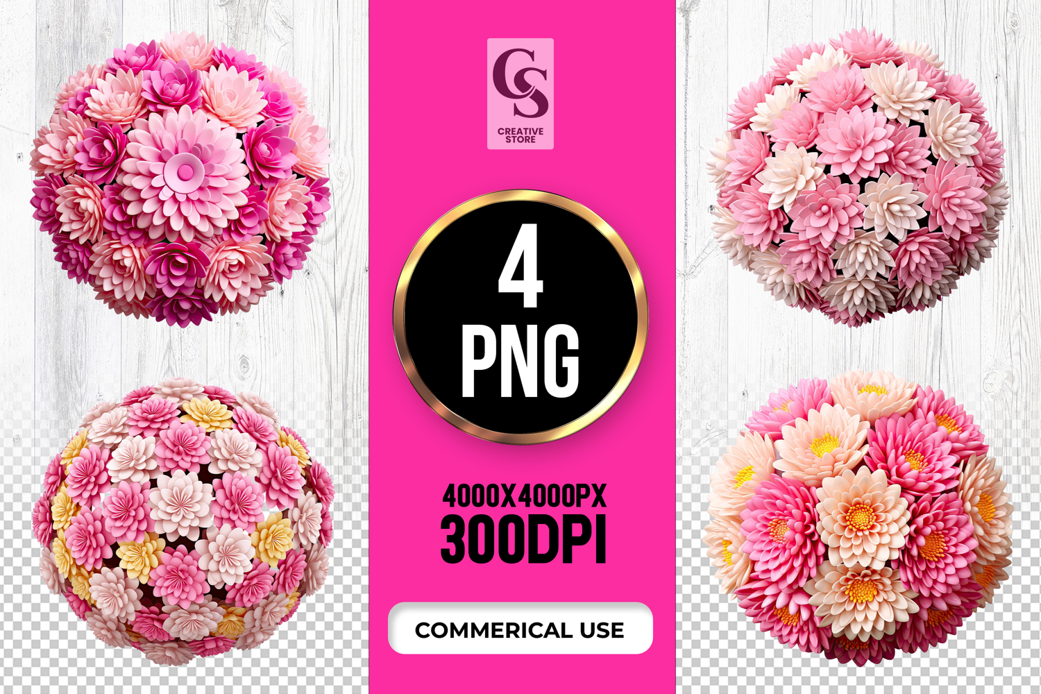 4 Pink Floral Bouquet Clipart Sublimation PNG Files Perfect for Greeting Cards, Invitations, Junk Journal, Party Decor, Scrapbooking and many other craft projects.