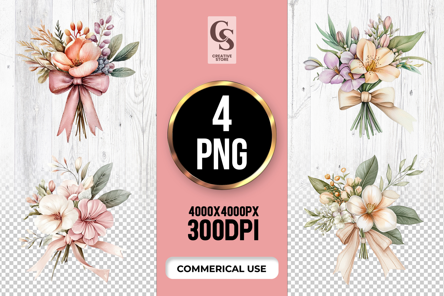 4 Elegant Floral Bouquet Clipart Sublimation PNG Files Perfect for Greeting Cards, Invitations, Junk Journal, Party Decor, Scrapbooking and many other craft projects.